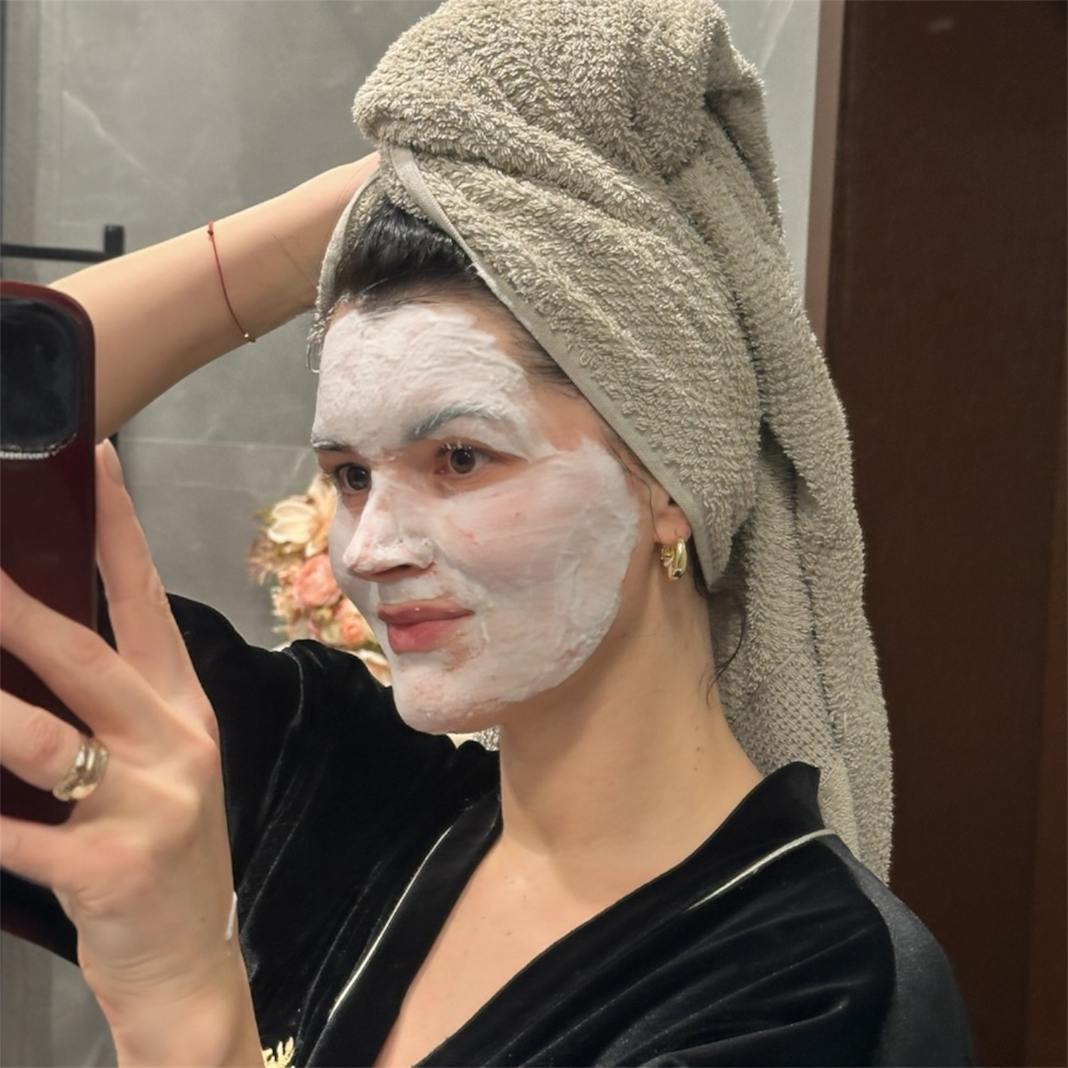 Paskirstykite tolygų kaukės sluoksnį ant švarios veido, kaklo ir dekoltė odos, vengiant akių ir lūpų srities. Palikite veikti 5–10 minučių, tuomet nuplaukite šiltu vandeniu.