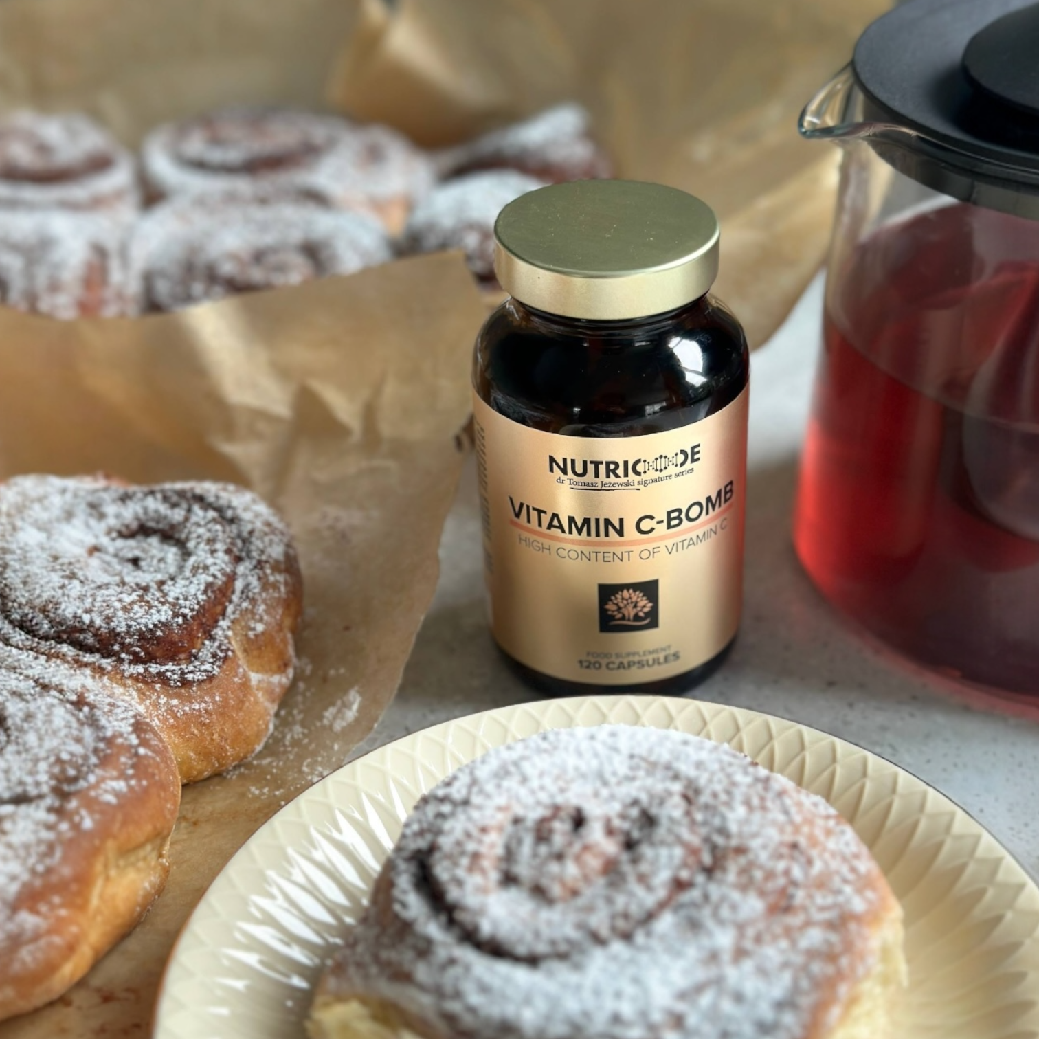 MAISTO PAPILDAS Vitamin C-Bomba – tai organinės kilmės, itin koncentruotas ir efektyvus vitamino C kompleksas, sukurtas bendradarbiaujant su medicinos mokslų daktaru Tomašu Ježevskiu. Sudėtyje – tik natūralūs vaisių ekstraktai (acerola, amla, erškėtuogės, Camu Camu), pasižymintys dideliu biologiniu prieinamumu, todėl organizmas vitaminą C įsisavina daug efektyviau nei iš sintetinių formų.